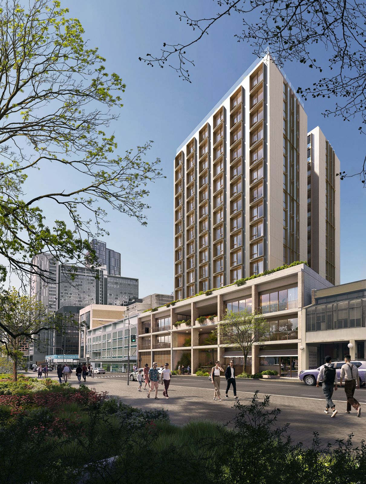 The tower façade takes advantage of panoramic outlooks through generous glazed openings. Residents will enjoy views of Parramatta Park, the CBD, the river, the Church Street precinct, and the Blue Mountains in the distance. A proposed roof-top terrace and layered communal spaces will also provide exceptional views and prime outdoor areas for occupants to enjoy within a metropolitan area.