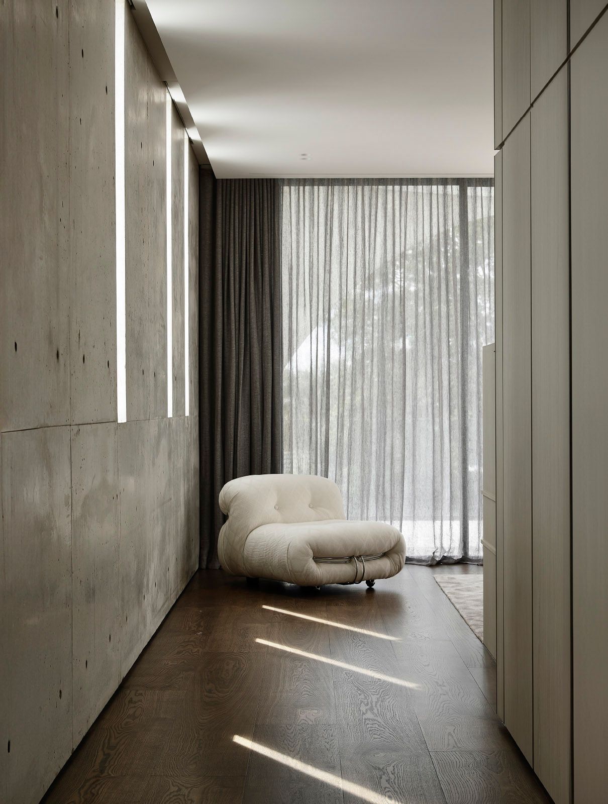 The master bedroom is defined by its sculptural concrete forms, creating a serene interplay of texture, light, and spatial elegance.