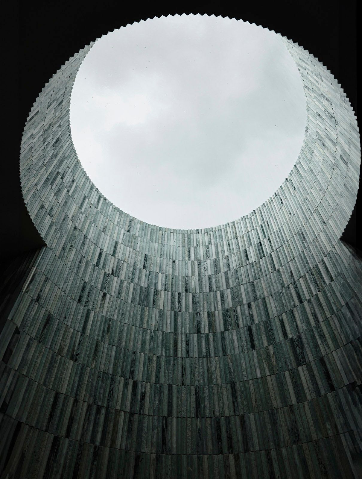 The feature bathroom is centred around an oculus skylight, casting light onto textured tiles and accentuating the curvilinear walls.