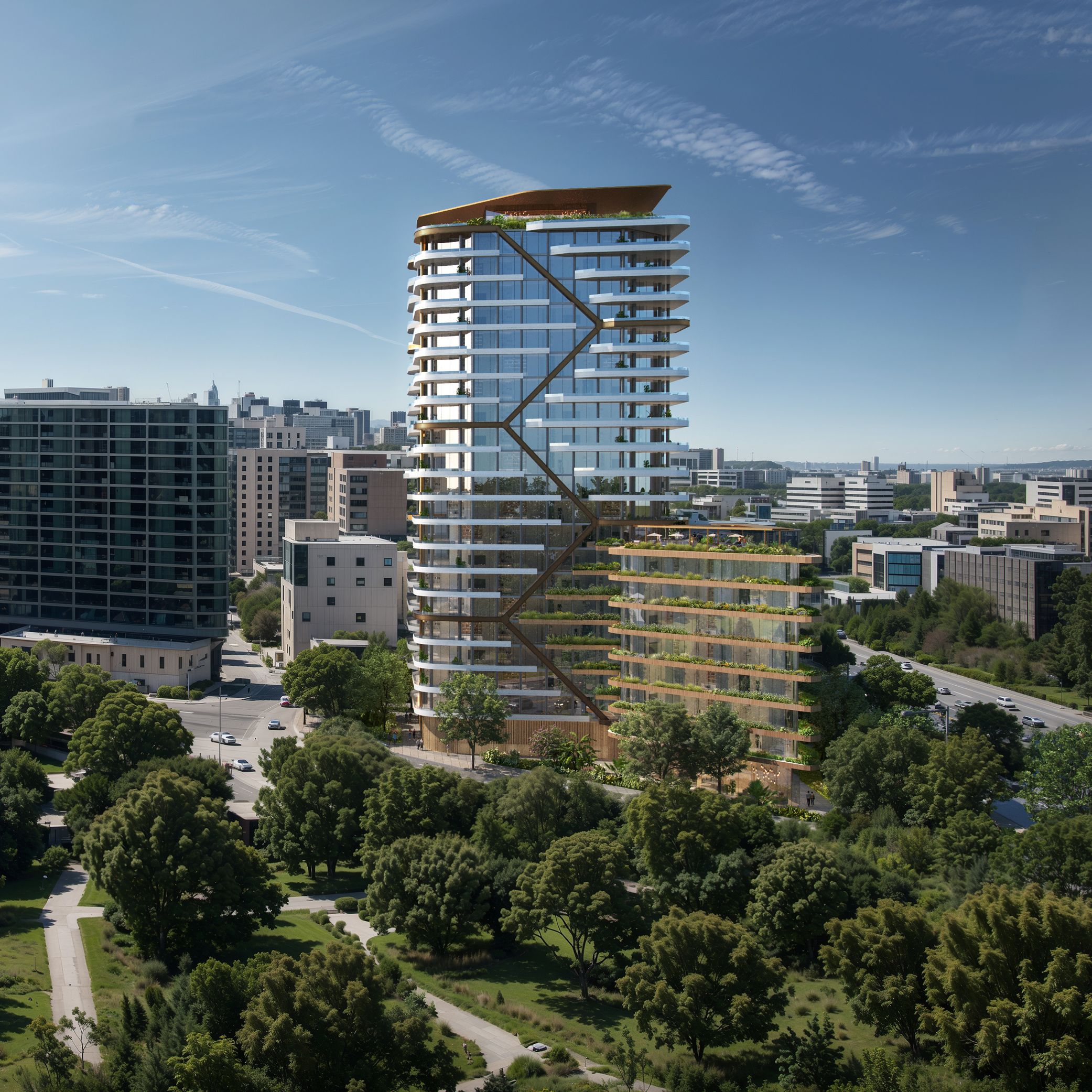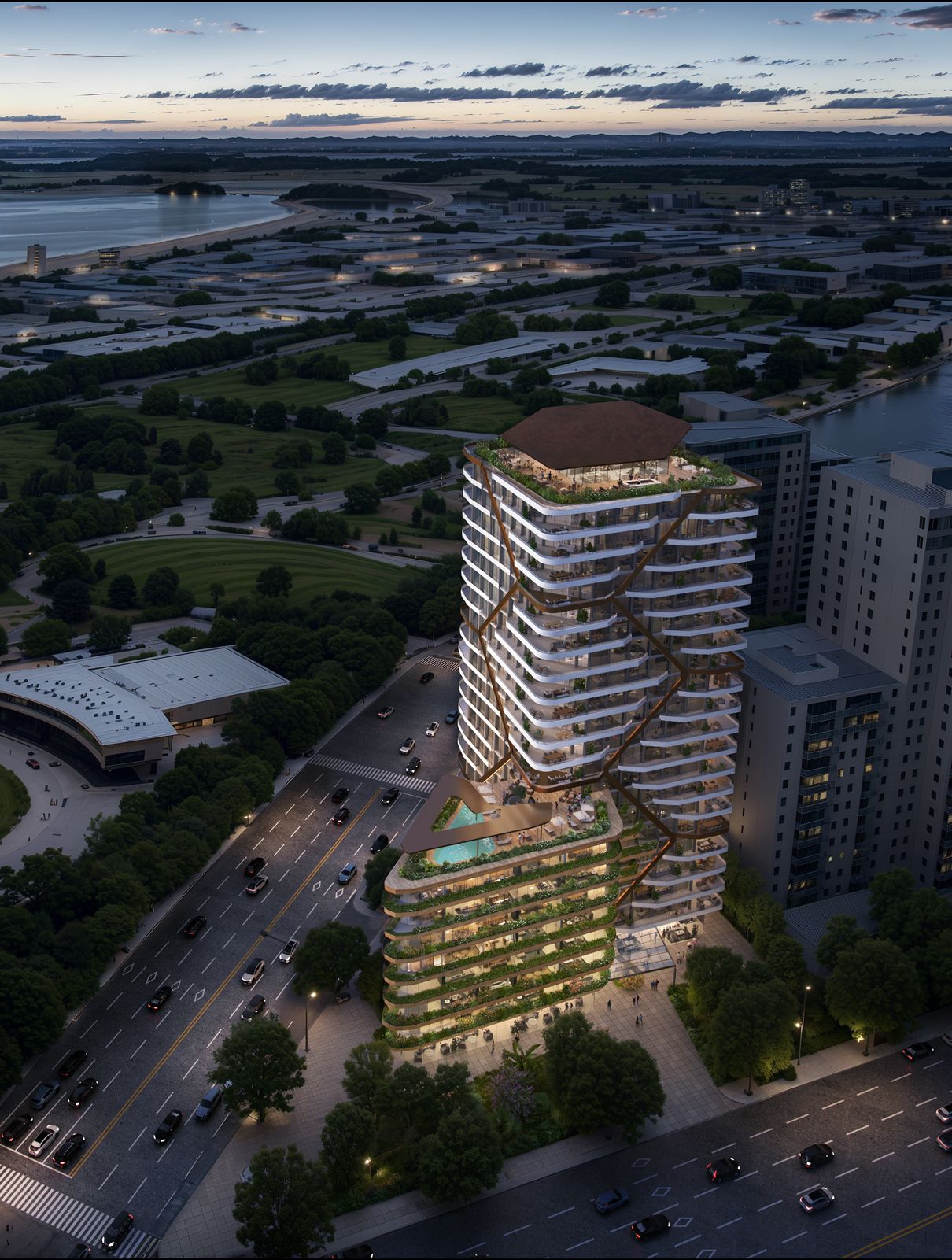 The design reimagines the existing tower with a refined residential language—introducing deep balconies and a sculpted podium extension. The result is a collection of 210 well-connected, city-fringe residences with expansive views and strong urban amenity.