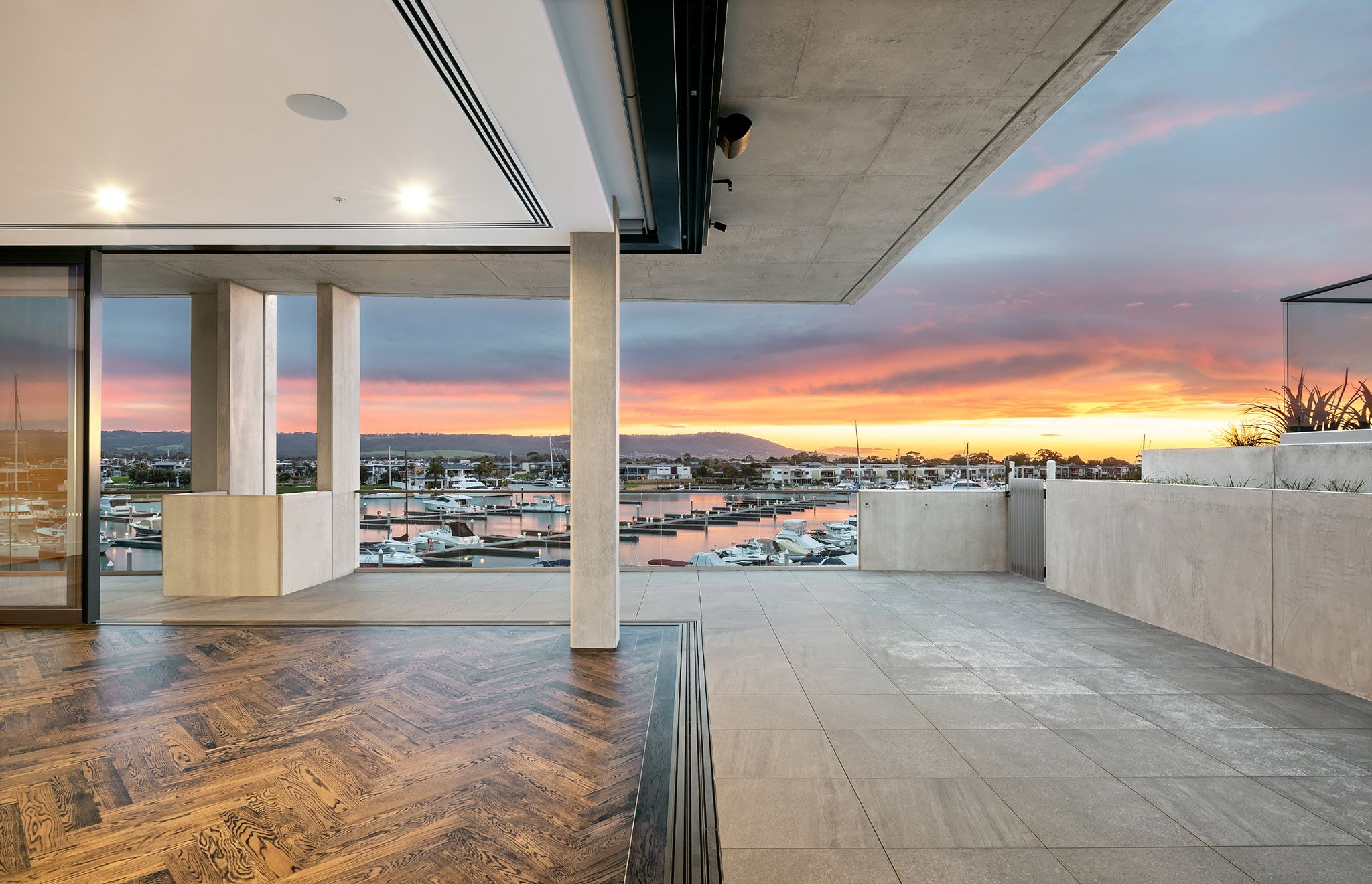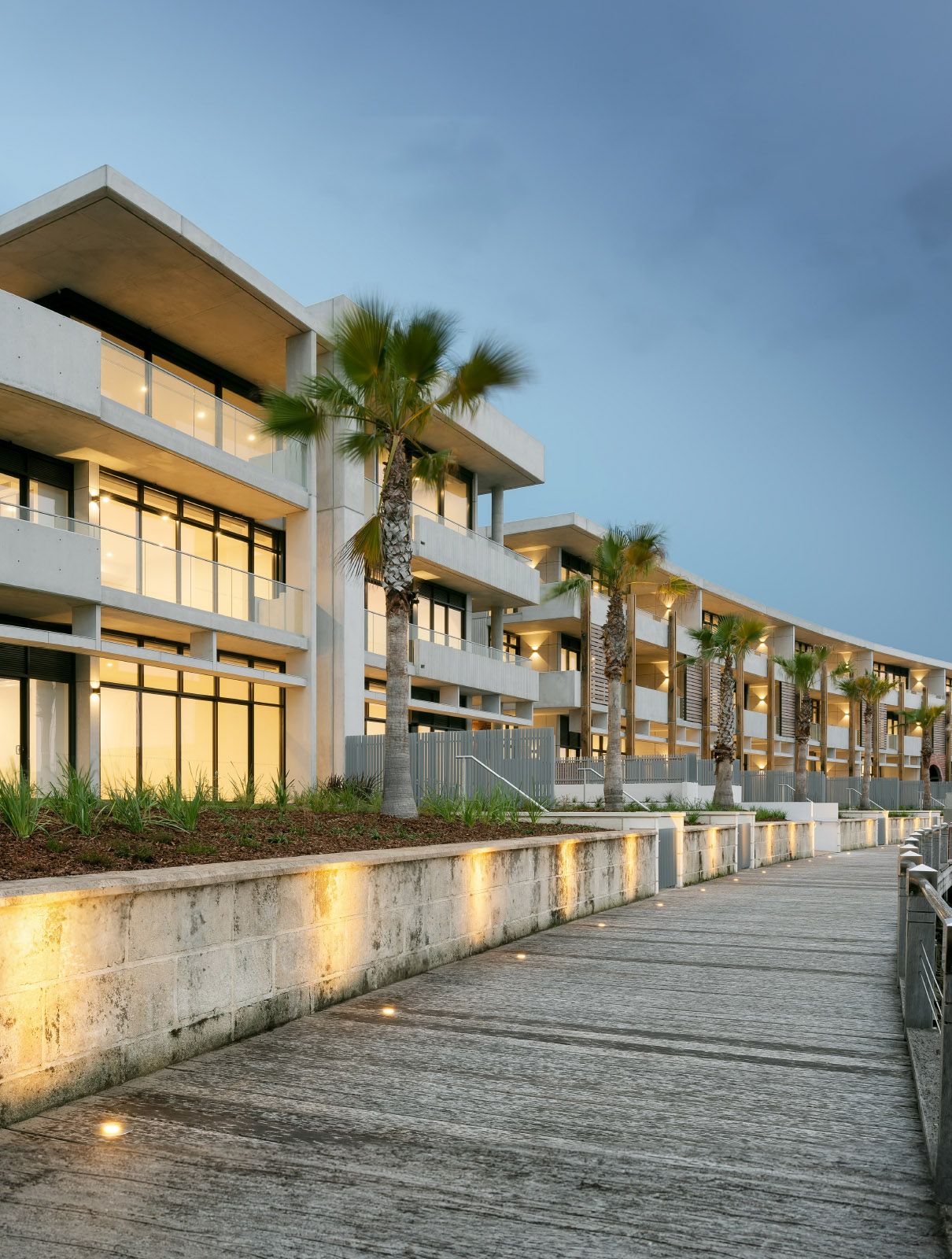 A restrained palette of stone, raw concrete, and natural materials, softened by greenery, combines with sweeping, artisan-crafted concrete curves, evoking the craftsmanship of traditional boatbuilding and creating a warm, inviting space.