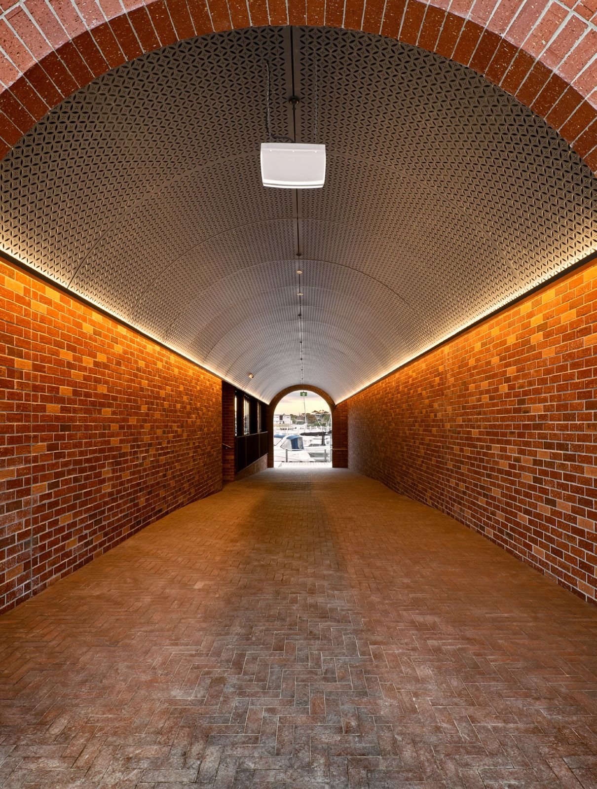 The architecture features robust brickwork, curved forms, and textured materials, complemented by timber details, enhancing its connection to waterfront surroundings.